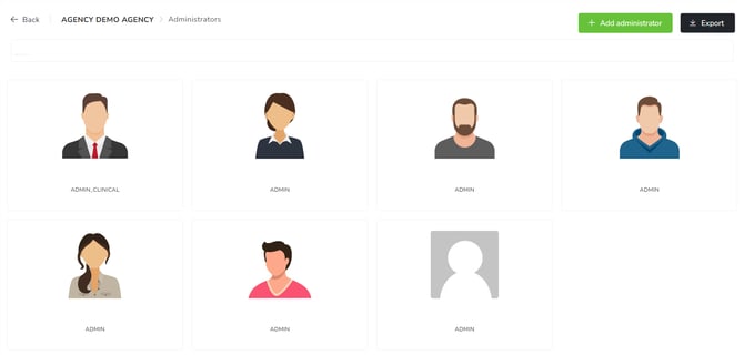 In this section, you will be able to find, add and remove the administrators of the agency. On the right corner of the board, you have two options: Add administrator and Export.