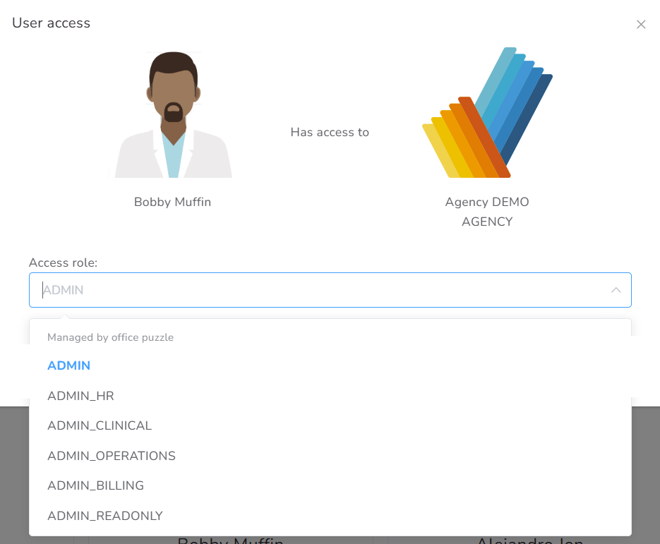 - ADMIN_CLINICAL: Accesses to manage all agency-level information related to the clinical side. Limited access to users but full access to the clients.