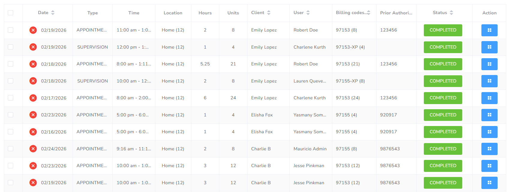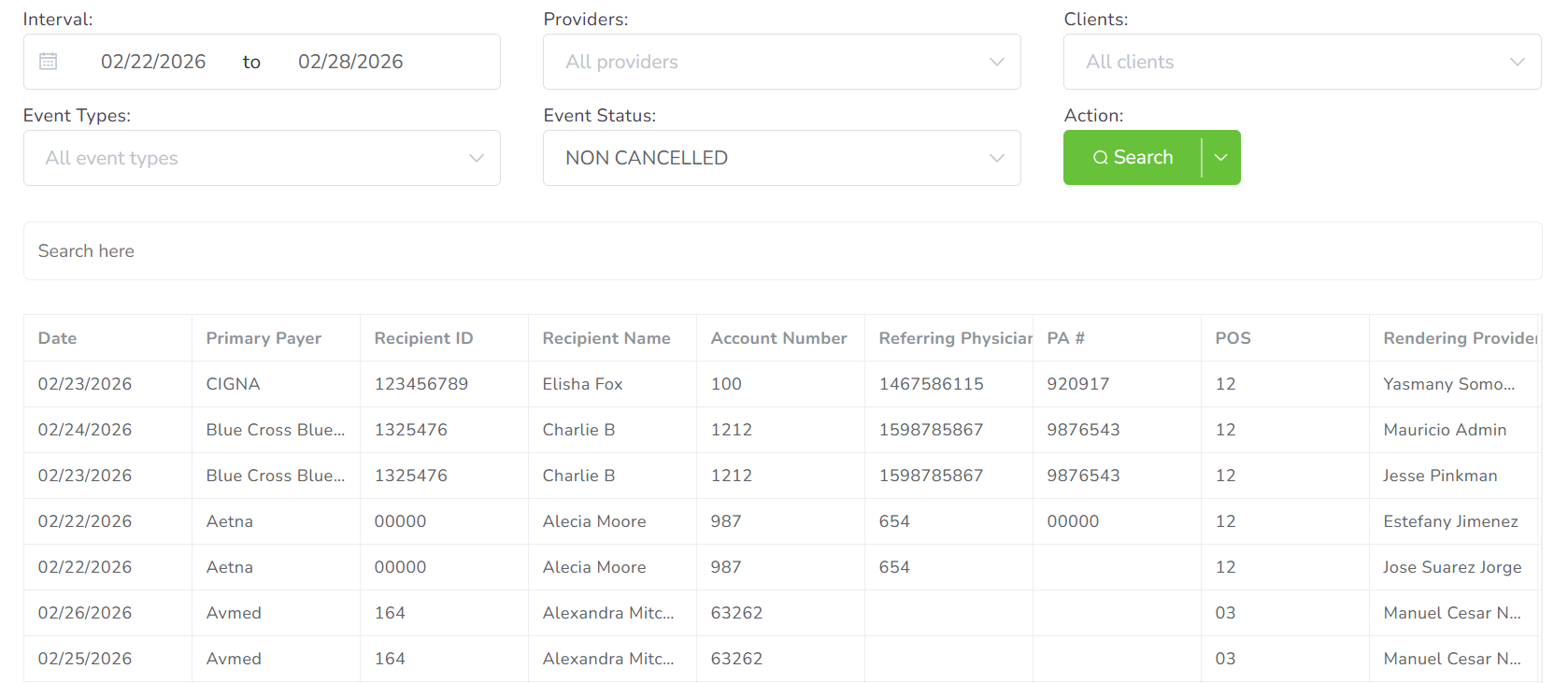 In this section, you will be able to find and visualize in table form all the events that belong to every client and user in the agency. Right next to the Date, you will see an alert icon that will point you to the status of this event.