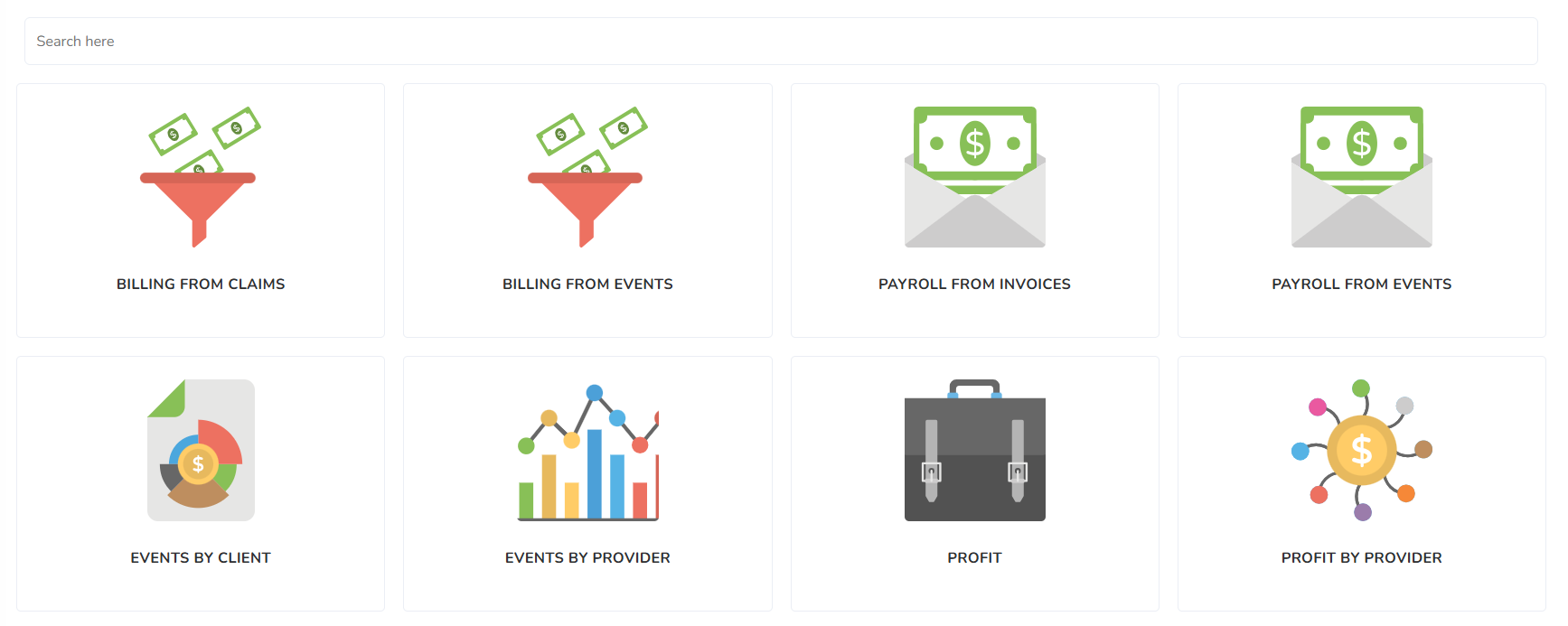 In this section, you will be able to find, visualize and export in a table from several reports from the agency: billing, payroll, users, clients, etc.