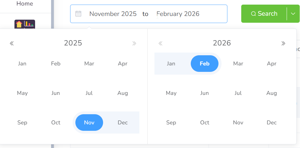 You can change the dates in the top left-corner selector. Please be aware that the list of available data will depend also on the approved start/end dates for every element in the Service Plan. By default, the last four months are displayed.