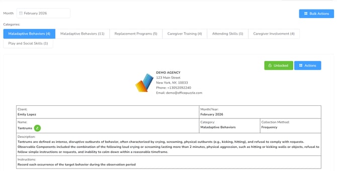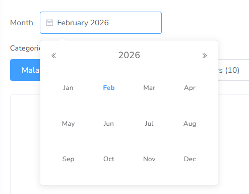 You can change the month in the top left-corner selector. Please be aware that the list of available Datasheets will also depend on the approved start/end dates for every element in the Service Plan. If an element has no defined start/end date, it will be available to collect data for every month past and future.