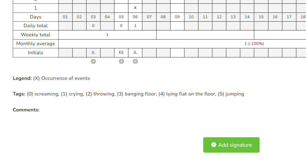 - Initials – It will show the initials of the person who collect the data. The initials can be modified, but will keep a record of the first person that collected the data. Below the Initials, there is a gearwheel, which will allow you to display a series of options related to the data: Ignore, Mark as Baseline, Change initials, Info and Delete.