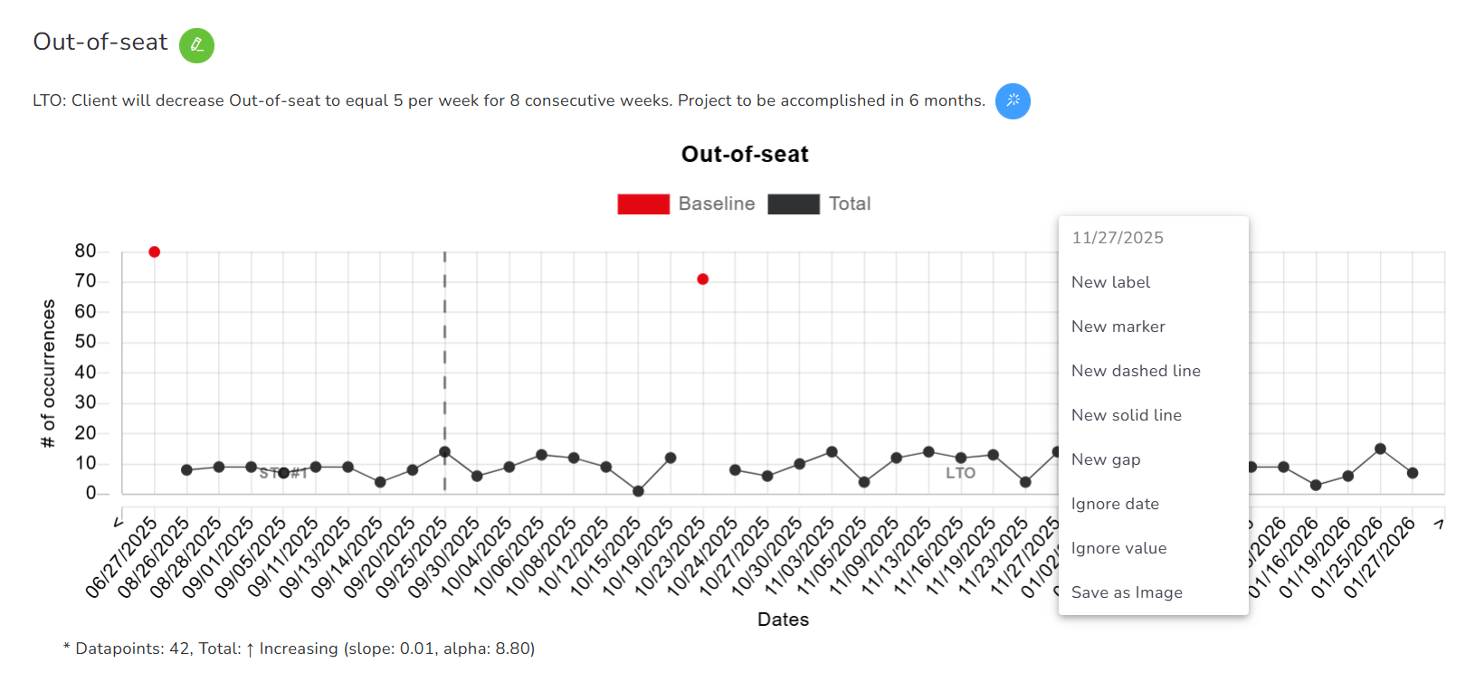 Ignored values and dates can be restored within the item’s configuration in the Chart tab, and deleting the value/date and the gap will disappear from the chart.