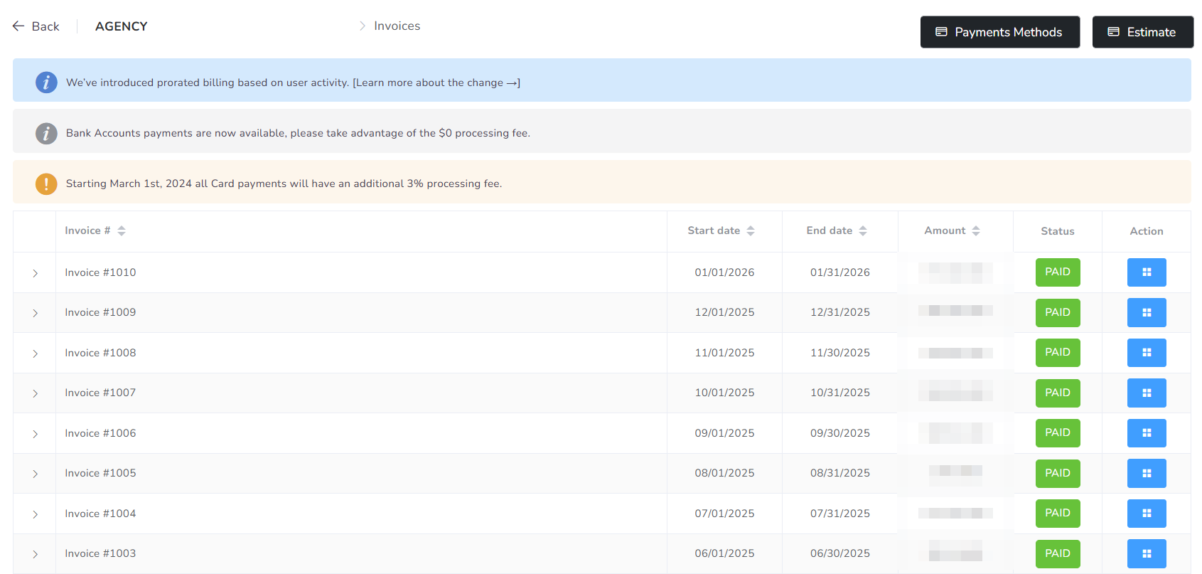 You can see the Invoice Number, Start & End dates, Amount, Status, Actions.