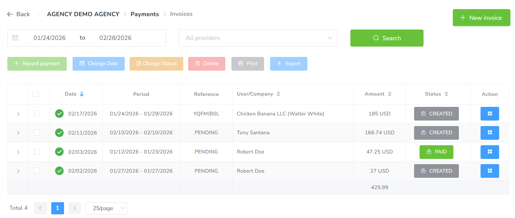 - Status: They are several statuses for the invoice: Created, Confirmed, Rejected, Cancelled, Submitted, Pending, Paid, and Declined.