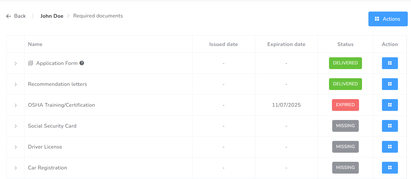 Each document might have an Issued Date and Expiration date. This is not required for all of them. But if required, the platform will closely monitor how close we are to the expiration date. You will be able to see how much time remains until it expires.