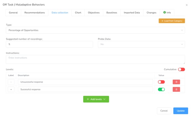 | Trial | Several ways to easily record whether a response has been Correct, Incorrect, or there was no response to the test applied. | Discrete Trial Teaching, Incident Teaching, Percentage of Opportunities |