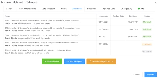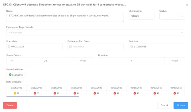 Note on Automated Updates: Short-Term Objectives (STOs) do not update, change status, or transition to Mastered automatically. While the system provides recommendations for "Met" dates based on the inserted data, it remains the BCBA’s responsibility to review the data, select the appropriate date, and manually mark the STO as mastered.