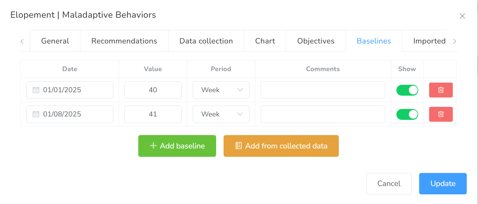 Users have two options for establishing a baseline: entering data manually or generating it from existing records.