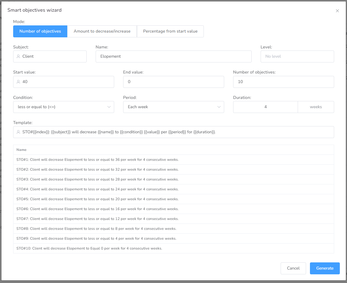 - Generate Objectives – Launches an interactive wizard that guides you through selecting specific criteria to automatically compose the objectives.