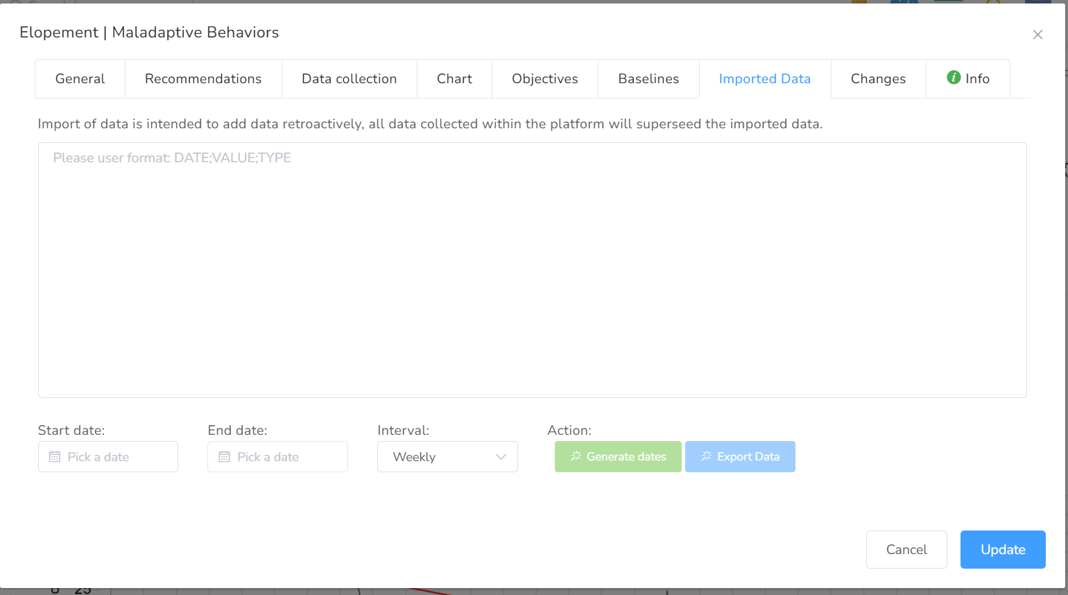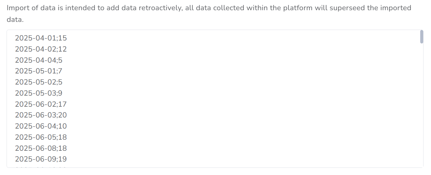 If you have data collected outside of Office Puzzle, you can import it for each element in the service plan. To do this, your data must be structured in the following format: DATE;VALUE;TYPE.