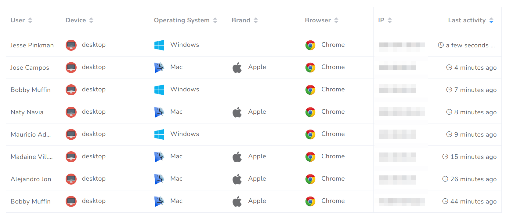 If you are interested in knowing the last activity of your users, you can use this section for that purpose. The results are displayed in tabular form by User, Device, Operating System, Brand/Model, Browser, IP, and last activity.