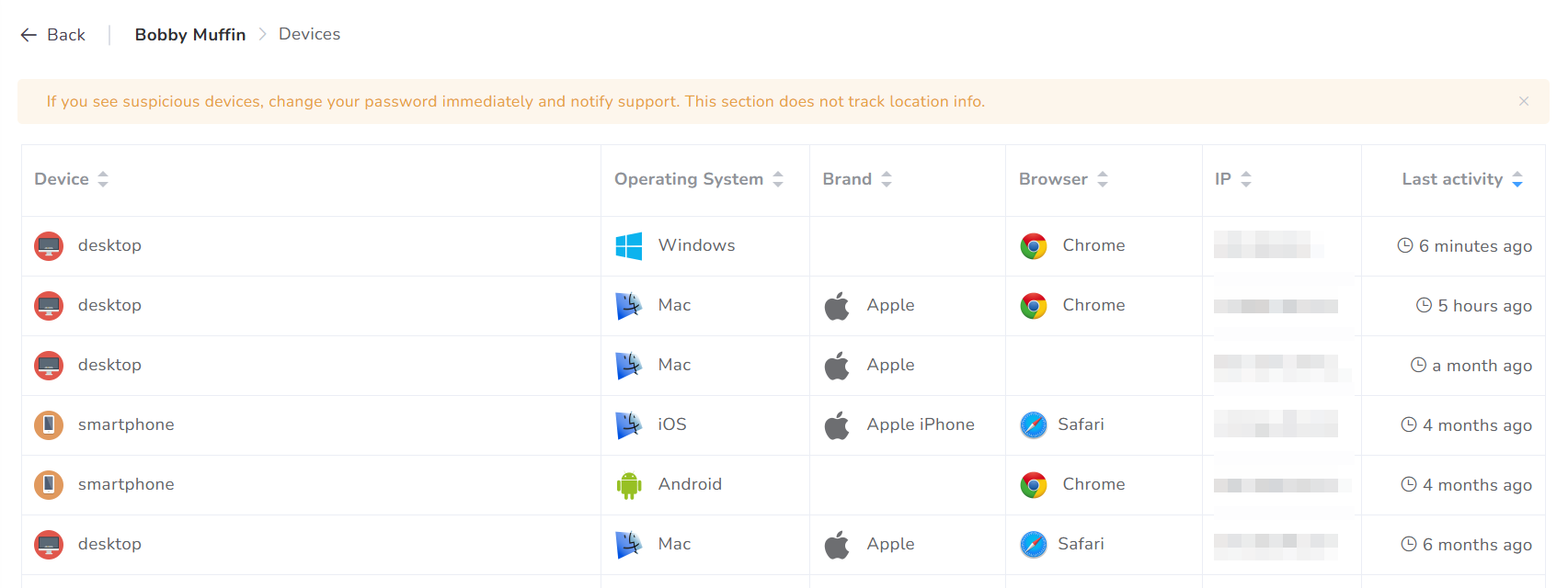 Devices You can use this section to knowing the last activity of your profile. The results are tabular displayed by Device, Operating System, Brand/Model, Browser, IP, and Last activity.