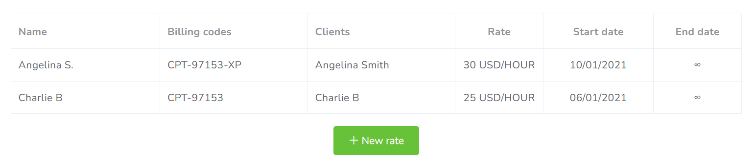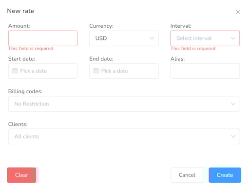 In this tab, you will be able to modify/configure the rates for this user. Rates are particularly useful for the generation of Invoices. Click on New rate to add and configure a new rate for this user.