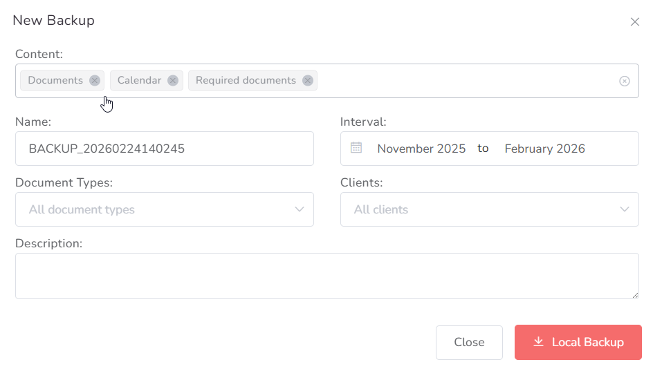 If you are an administrator and would like to request a full backup of the User, click on the Request Backup button. There, you can choose the content of the user profile you want to back up, as well as the Interval, the Document types and the Clients.